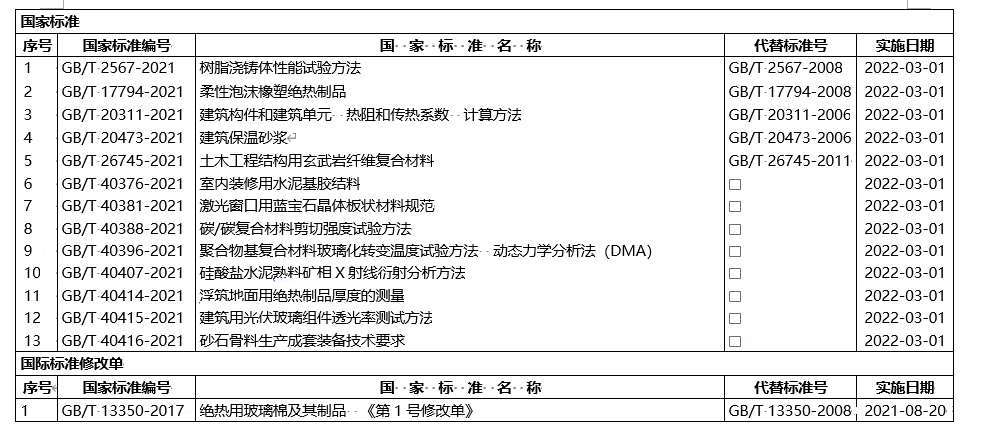 近日,國家市場監督管理總局(國家標準化管理委員會)發布了《中華人民共和國國家標準公告》(2021年第11號),批準發布了13項建材行業國家標準和1項國家標準修改單(見附表)。