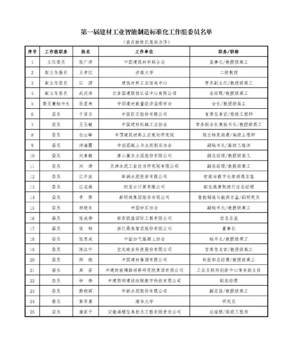 張廣沛宣讀了中國建筑材料聯合會《關于批準成立建材工業智能制造標準化工作組的公告》,第一屆工作組由25名委員組成,張廣沛任主任委員,王孝紅、江源、武慶濤任副主任委員,孫星壽任委員兼秘書長,秘書處承擔單位為中國建材數量經濟監理學會。根據工作需要,工作組還聘請了馬進元等18名專家。