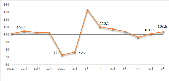 2022年9月份建筑材料工業景氣指數為103.6點,比上月回升2.6點,高于臨界點,建筑材料工業景氣度繼續回升。