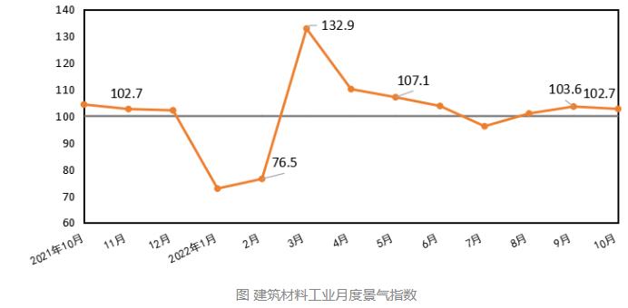 2022年10月份建筑材料工業景氣指數為102.7點,比上月回落0.9點,高于臨界點,建筑材料工業仍處于景氣區間。