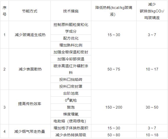 技術路徑:(1)采用先進技術手段對窯爐整體結構、材料進行優化,綜合技術措施效率最大化。(2)采用0#氧槍、富氧或全氧燃燒技術。通過富氧代替部分或全部空氣助燃風,提高火焰燃燒溫度,增加火焰輻射效率,加強配合料的預熔、減少煙氣生成量,減少煙氣帶走熱量。(3)采用電助熔技術,利用高效率的電能代替部分火焰加熱,同時可減少煙氣生成量,減少煙氣帶走熱量。(4)采用多級池底臺階結構,配合卡脖水包控制進入成型和回流的玻璃液量,減少玻璃重復加熱。(5)采用單排或多排鼓泡,加強玻璃液的強制對流,提高玻璃液吸熱效率。