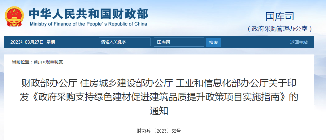 為推進政府采購支持綠色建材促進建筑品質提升政策實施工作,財政部、住房城鄉建設部、工業和信息化部制定了《政府采購支持綠色建材促進建筑品質提升政策項目實施指南》,現印發給你們,請納入政策范圍的有關城市(市轄區)參照執行。