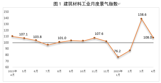 2023年4月份建筑材料工業景氣指數為108.0點,高于臨界點,處于景氣區間,景氣指數繼3月份快速回升后,4月雖然有所放緩,但仍延續回升態勢。