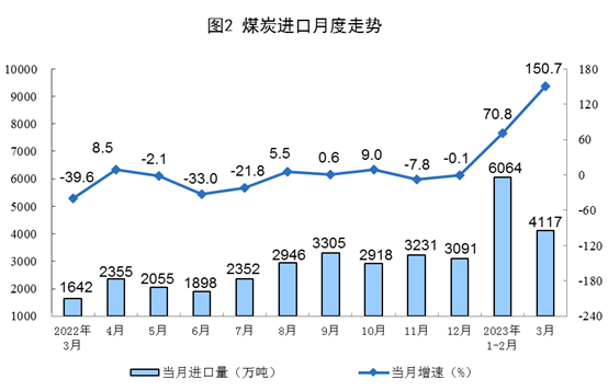 原煤生產穩定增長,進口大幅增加。3月份,生產原煤4.2億噸,同比增長4.3%,增速比1—2月份放緩1.5個百分點,日均產量1346萬噸。進口煤炭4117萬噸,同比增長150.7%,增速比1—2月份加快79.9個百分點。