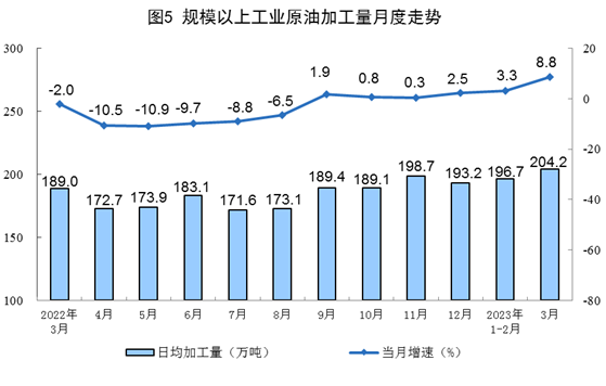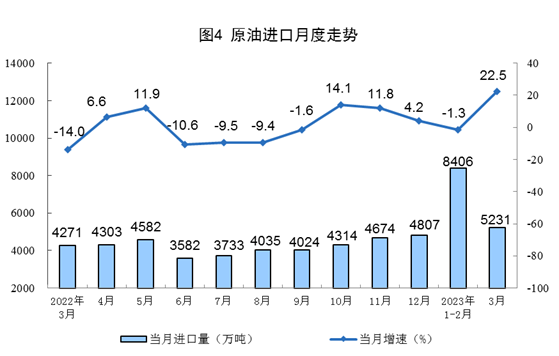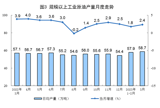 原油生產略有加快,進口由降轉增。3月份,生產原油1818萬噸,同比增長2.4%,增速比1—2月份加快0.6個百分點,日均產量58.7萬噸。進口原油5231萬噸,同比增長22.5%,1—2月份為下降1.3%。