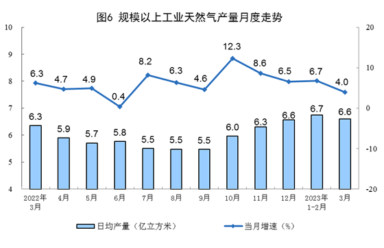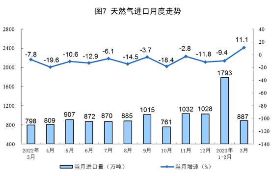 天然氣生產有所放緩,進口由降轉增。3月份,生產天然氣205億立方米,同比增長4.0%,增速比1—2月份放緩2.7個百分點,日均產量6.6億立方米。進口天然氣887萬噸,同比增長11.1%,1—2月份為下降9.4%。
