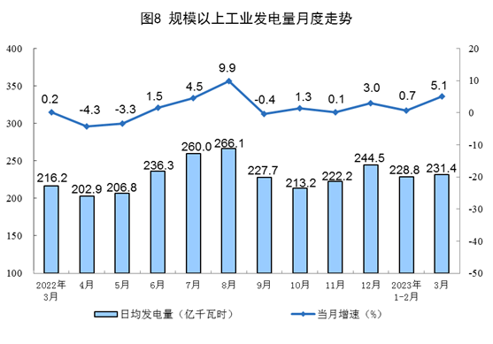 電力生產增速加快。3月份,發電7173億千瓦時,同比增長5.1%,增速比1—2月份加快4.4個百分點,日均發電231.4億千瓦時。1—3月份,發電20712億千瓦時,同比增長2.4%。