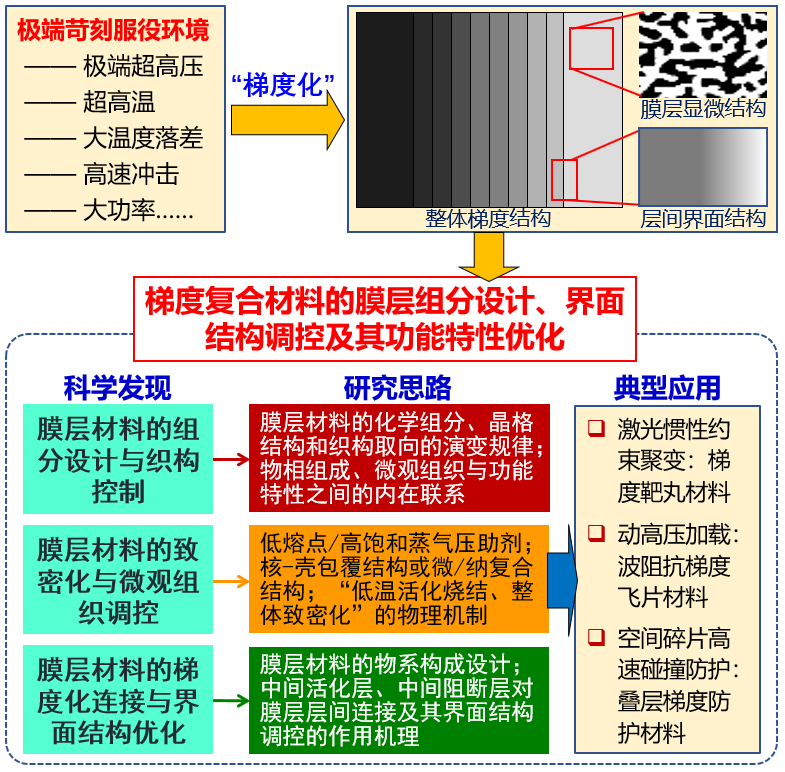 梯度復合材料是確保我國國防軍工等戰略領域自主可控、安全獨立的核心關鍵材料。該項目圍繞梯度復合材料的膜層組分設計、界面結構調控及其功能特性優化開展了系統工作,探究并解決了各膜層的形成、膜層組分、結構控制及其梯度化構筑的相關基礎問題。