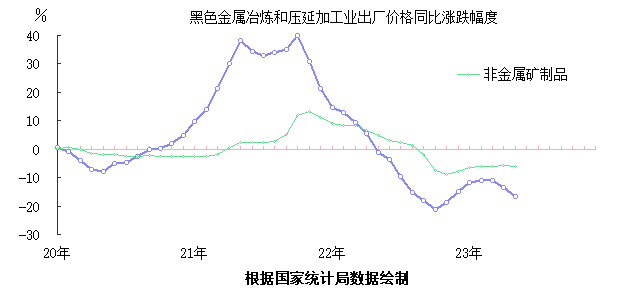 自去年5月份以來,鋼鐵價格已持續13個月下降。非金屬礦物制品業價格是從去年9月份開始的下降,至本月持續9個月下降。
