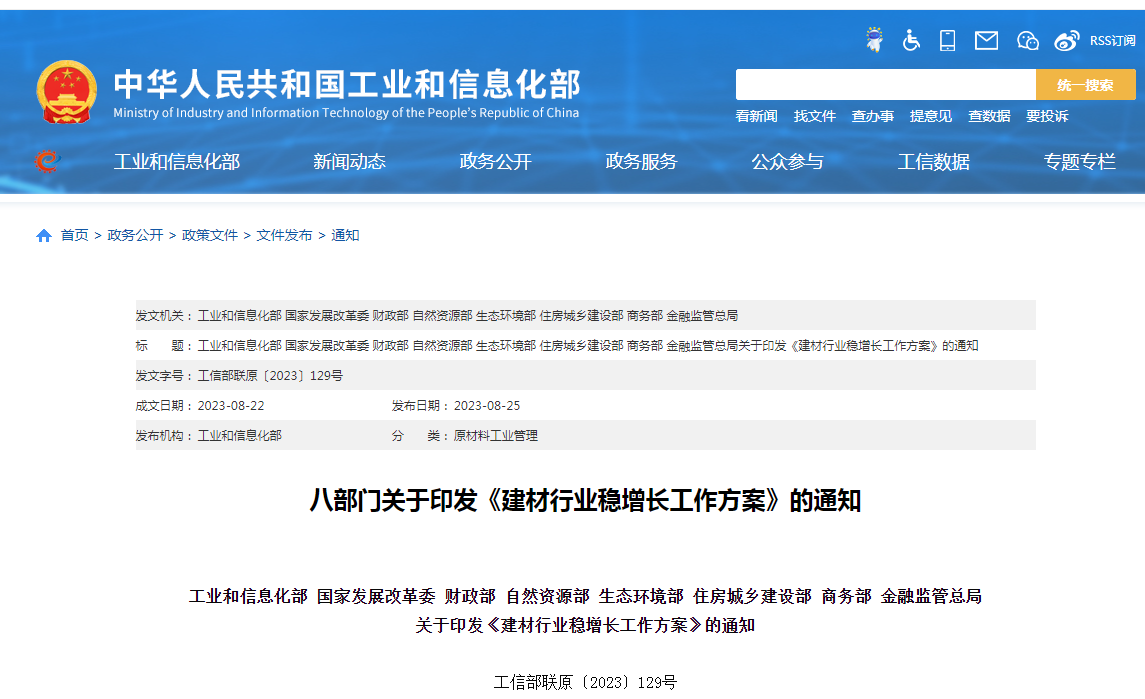 建材行業是國民經濟的重要基礎產業,是改善人居條件、治理生態環境和發展循環經濟的重要支撐,是建筑建設、國防軍工和戰略性新興產業發展的重要保障,是關乎工業經濟平穩運行的重要領域。為貫徹落實黨的二十大精神和中央經濟工作會議決策部署,推動國務院抓實抓好經濟一攬子政策和接續措施全面落地見效,把穩增長擺在首要位置,加快推動建材行業高質量發展,特制定本方案,實施期限為2023—2024年。以習近平新時代中國特色社會主義思想為指導,全面貫徹黨的二十大精神,全面落實中央經濟工作會議部署,立足新發展階段,完整、準確、全面貫徹新發展理念,加快構建新發展格局,堅持穩中求進工作總基調,以推動高質量發展為主題,充分發揮市場在資源配置中的決定性作用,更好發揮政府作用,統籌擴大內需與深化供給側結構性改革,促投資、優供給、擴消費,加快建材行業高端化、智能化、綠色化、融合化發展,提升產業鏈供應鏈韌性及綠色化發展水平,促進建材行業質的有效提升和量的合理增長。堅持傳統產業轉型與新興產業培育相結合。處理好短期和長期、發展和減排的關系,加快推動水泥、平板玻璃等傳統產業轉型升級,加快推動高性能纖維及復合材料、先進陶瓷等新興產業培育壯大,優化產業結構,增強發展動能。堅持供給水平提升與市場需求開拓相結合。著力發揮技術創新的支撐作用,豐富產品品種、提升產品品質,增強品牌影響力。充分發揮市場需求牽引作用,擴展建材產品應用領域,加強國際綠色低碳合作。堅持生態培育優化與產業協同推進相結合。充分發揮各方作用,營造良好氛圍,穩定市場預期。加強與相關產業協同發展,促進能源資源的梯級利用和產業循環銜接,提升產業鏈供應鏈韌性和安全水平。2023—2024年,建材行業穩增長的主要目標是:行業保持平穩增長,2023年和2024年,力爭工業增加值增速分別為3.5%、4%左右。綠色建材、礦物功能材料、無機非金屬新材料等規上企業營業收入年均增長10%以上,主要行業關鍵工序數控化率達到65%以上,水泥、玻璃、陶瓷行業能效標桿水平以上產能占比超過15%,產業高端化智能化綠色化水平不斷提升。1.推進綠色化改造。全面落實《建材行業碳達峰實施方案》,支持有條件的地區和企業開展綠色低碳先行示范,探索并推廣有效模式和經驗。重點圍繞用能結構轉換、節能降碳減排、資源綜合利用等方面,支持產融合作,加大綠色低碳技術改造力度。以水泥、平板玻璃、建筑衛生陶瓷、玻璃纖維等行業為重點,分年度發布節能降碳技術目錄、應用指南,推廣“解剖麻雀”試點,總結改造方案,支持建設一批示范項目,支持建材企業爭創環保績效A級。優化建材行業能源結構,推動實施清潔能源替代。優先采用源頭削減、過程控制等措施,有序推進水泥行業超低排放改造,推動玻璃、陶瓷、玻璃纖維等行業深度治理,推進減污降碳協同控制。探索以零外購電、零化石能源、零一次資源、零碳排放、零廢棄物排放、零一線員工的“六零”工廠為目標,鼓勵企業開展技術攻關和升級改造,建設示范工廠。2.推進智能化轉型。宣貫實施《建材行業智能制造標準體系建設指南(2021版)》,加快研制一批重點細分領域智能裝備、智能工廠、智能服務、智能賦能技術、集成互聯等關鍵標準。推廣建材行業鼓勵推廣應用的產品和技術目錄,引導加快建材工業數字化轉型、智能化升級。以礦山開采、原料制備、破碎粉磨、窯爐控制、物流倉儲、在線檢測、能源管控、設備運維等為重點,遴選一批智能制造創新平臺、智能工廠、數字礦山等典型案例,培育系統解決方案,鼓勵第三方機構搭建平臺促進推廣應用。推動建材行業工業互聯網應用,鼓勵有條件地方建立建材行業工業互聯網平臺和大數據中心,支持數字化管理、網絡化協同、服務化延伸、智能化生產等新模式發展。3.推進耦合化發展。支持各地結合地區廢棄物綜合利用情況,以水泥窯、墻體材料隧道窯協同處置技術改造,新型墻體材料和機制砂石等項目建設為契機,促進區域內產業耦合發展。重點圍繞尾礦、工業副產石膏等大宗固廢,建設一批綜合利用示范項目。鼓勵有條件地區建立原材料工業耦合發展園區,完善產業循環鏈條。加快建材行業既有園區和產業集群升級,開展節能減排、循環利廢改造。在保證產品質量和生態安全前提下,鼓勵企業在水泥、混凝土、墻體材料、預拌砂漿、固廢陶粒輕骨料和機制砂石等產品中提高消納產業廢棄物能力,逐步拓展和拓寬可消納固廢的品種。